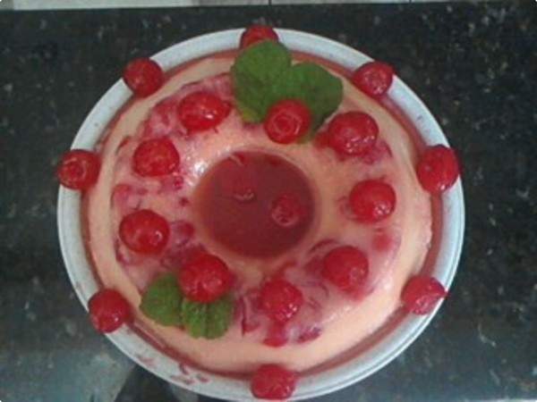 - Quando a calda estiver pronta, jogue por cima a receita do pudim junto com o resto das cerejas picadas. (não é necessário mexer)