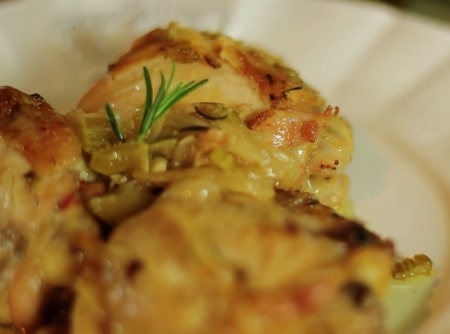 - Coloque as sobrecoxas sobre os vegetais, adicione o vinho branco, cubra e leve ao forno por 45 minutos a uma hora ou até o frango estar macio.