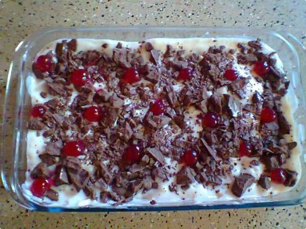 • Por cima encerre com a camada do creme branco, o restante do chocolate picado e decore com as cerejas em calda.