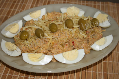 • Disponha num refratário e decore com batata palha, ovos cozidos e azeitonas.