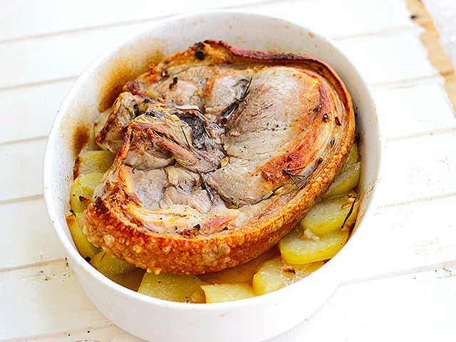 • Em uma assadeira acomode as rodelas de batatas, coloque o pernil por cima delas e leve para assar em forno preaquecido em 280°C por 1 hora ou até que esteja bem dourada.