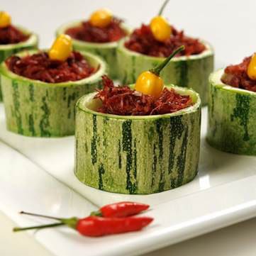 • Em um recipiente untado, coloque as abobrinhas e adicione o recheio da carne-seca em cada uma delas.