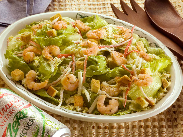 - Adicionar sobre as folhas de alface, o kani kama desfiado, a ricota ralada, o parmesão ralado, e por último os croutons.