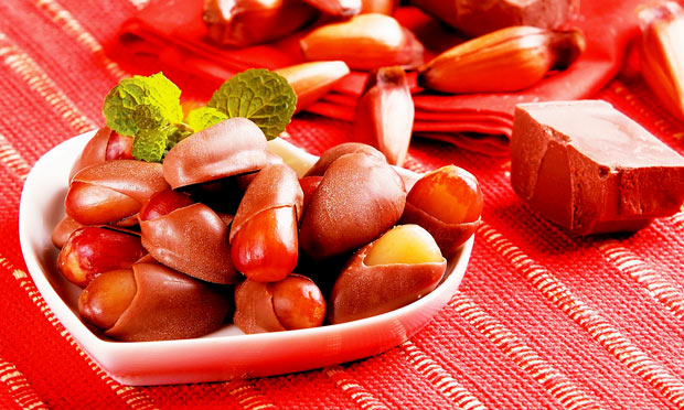 • Derreta o chocolate de acordo com as instruções da embalagem e banhe os pinhões.