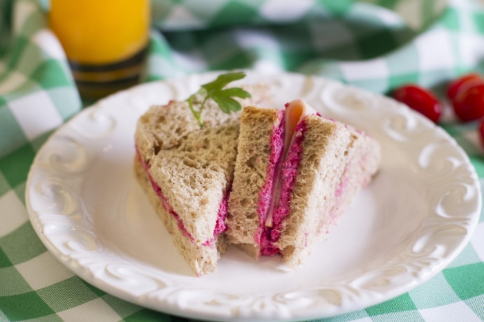 • Coloque 100 g de poulet, a beterraba e a cottage, e bata.