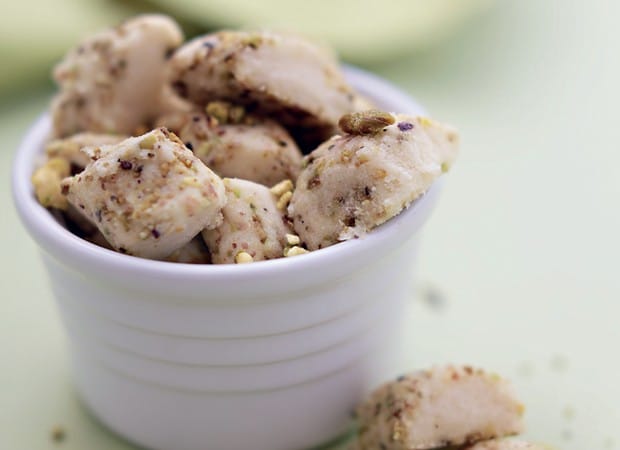 • Polvilhe o pistache sobre uma bancada e coloque sobre ela pequenas quantidades de massa. Modele, com as mãos, pequenos rolos com espessura de 1 cm.