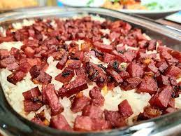 - Num refratário médio untado, distribua metade da quantidade de arroz e feijão, fatias de presunto rasgados, a muçarela e orégano a gosto.