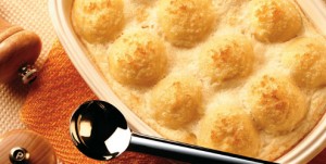 • Aproveite enquanto as batatas ainda estiverem quentes para amassá-las e misturá-las com 1/2 xícara de maionese light, as gemas, a maizena, o sal e a noz moscada.