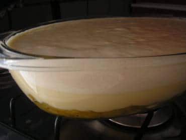 - Misture o leite condensado light, o leite desnatado, as gemas, o amido de milho e a essência de baunilha e leve ao fogo para engrossar ligeiramente.