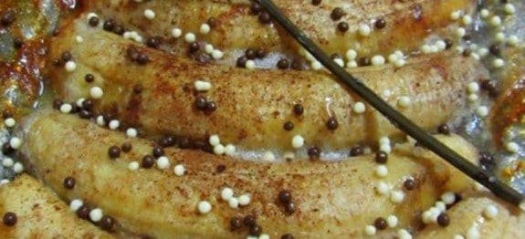 • Regue com a glucose cada uma das bananas, polvilhe com canela e açúcar de baunilha em cada unidade e espete um ou dois cravinhos em cada uma para aromatizar.