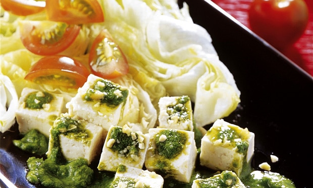 • Numa saladeira disponha as folhas de alface e, por cima, espalhe o tofu com o molho.