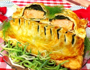• Espalhe a massa, espalhe o alho poró e a erva doce fresca sobre a massa, disponha o file de salmão sobre eles acrescente o espinafre sobre o salmão.