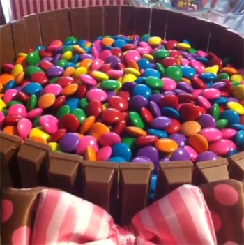 • Coloque cuidadosamente as barras de chocolate em volta e depois os confetes.