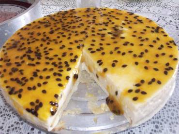 • Divida o bolo ao meio, regue com o suco de maracujá, despeje a metade da mousse.