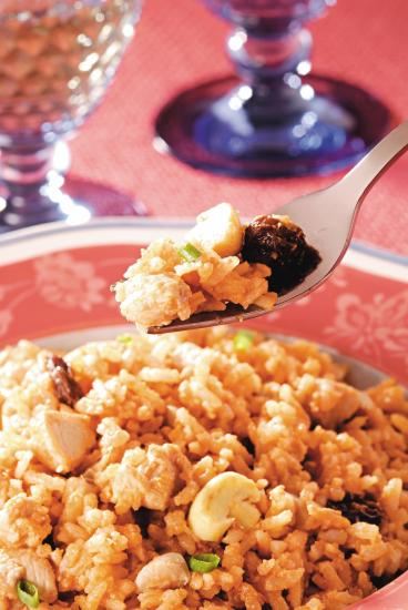 • Depois de cozido o arroz, coloque os pedaços de chester cozidos com bastante molho, o champignon, a castanha-do-pará e as nozes picadas, a uva-passa escorrida e o requeijão.