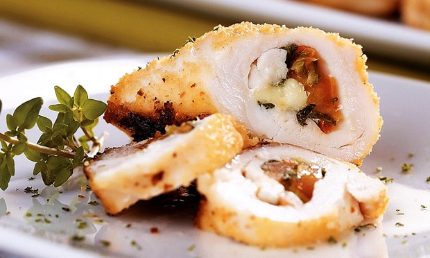 • Sobre cada filé de frango, coloque uma porção de recheio, enrole como um rocambole e prenda com um palito.