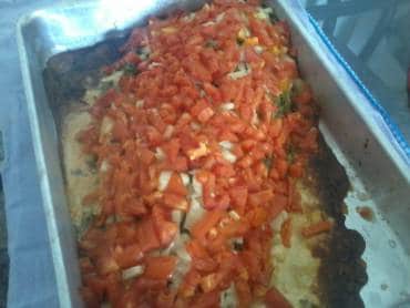 • Espalhe o coentro por cima, em seguida as cebolas e depois os tomates.