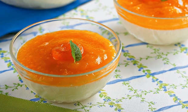 - Distribua em taças individuais e cubra com a geleia de damasco.