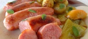 - Entretanto, numa frigideira colocar as linguiças sem pele e em rodelas, a cebola cortada em fatias finas e o alho-poró.