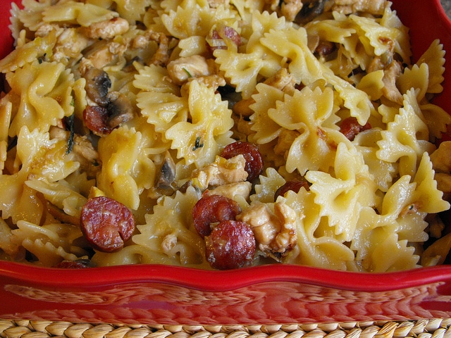 - Depois da massa escorrida, voltar a colocar no tacho, com o lume no mínimo e juntar o queijo mozarela e a mostarda.