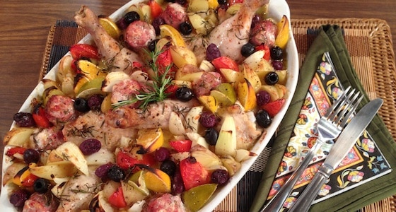- Entre eles coloque a batata cortada, os pedaços de linguiça, os tomates, a cebola, a laranja, o limão e as azeitonas, salpique por cima de tudo com algumas folhas de alecrim.
