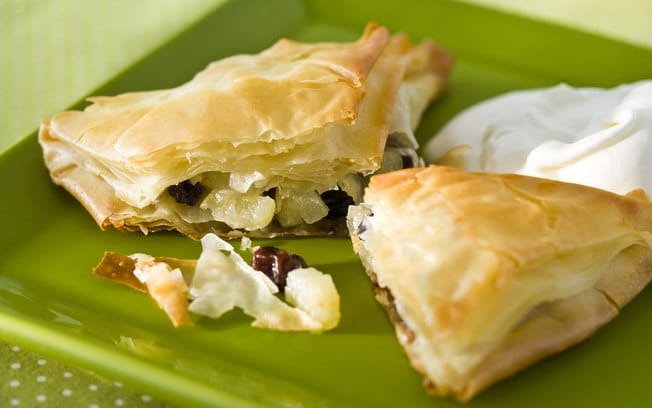• Pegue um pedaço da massa, pincele com a manteiga e coloque 1 colher (sopa) de recheio de pera no canto.