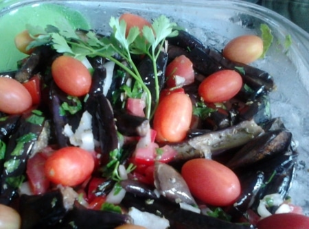 • Acomode as berinjelas em um prato grande e contorne-as com o vinagrete.