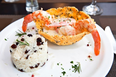- Coloque os camarões com o molho bechamel dentro da cestinha de parmesão.