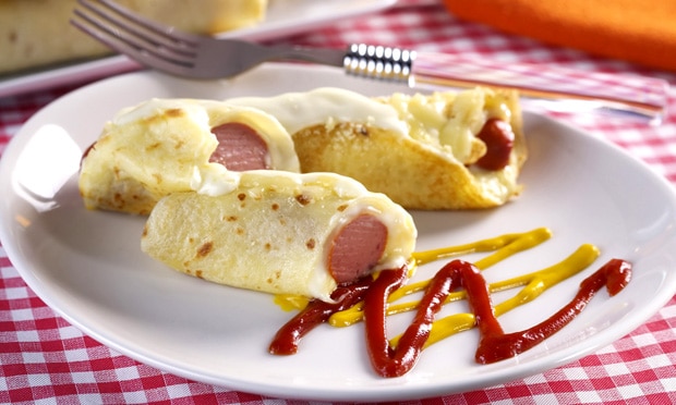 - Pegue a panqueca, coloque uma fatia de presunto, uma de queijo e o recheio de calabresa.