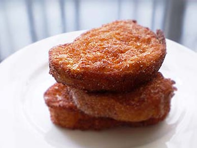 • Frite dos dois lados em óleo, retire, coloque em um prato com papel-absorvente e em seguida passe pela mistura do açúcar com canela.