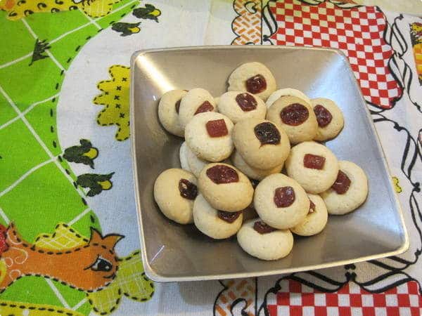 • No centro de cada uma, coloque um cubinho de goiabada e comprima-o sobre o biscoito para fixá-lo.