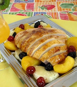 • Disponha a picanha suína em uma travessa e decore com as frutas.