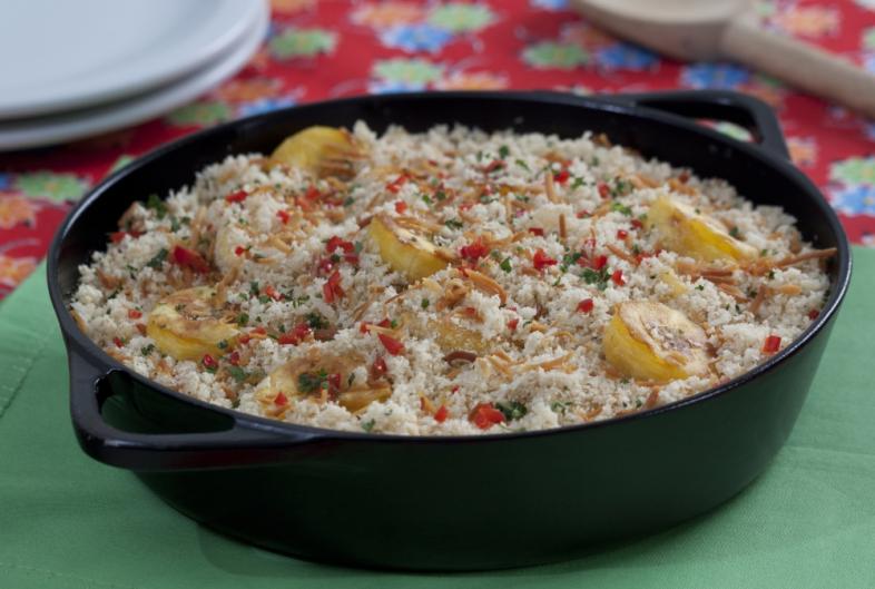 • Tempere com o sal, a pimenta, junte a banana e o coco reservados.