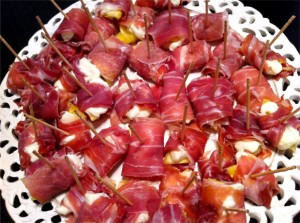 • Em fatias de Parma, coloque um pedacinho de abacaxi desidratado e a pontinha de uma colher de creme de ricota light.