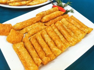 • Abra a massa bem fina, passe pelo ovo e o queijo parmesão ralado, enrole na salsicha e frite em óleo quente.