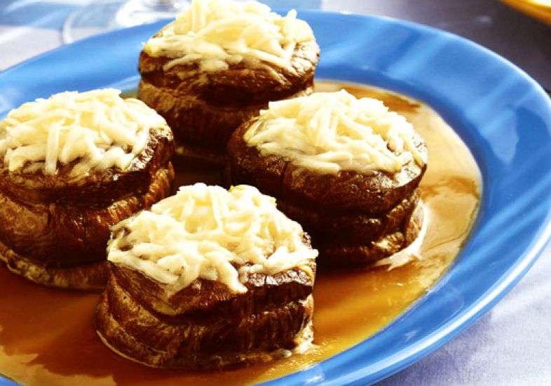 - Após o cozimento corte a carne em fatias, coloque-as em um pirex e cubra com o queijo provolone.