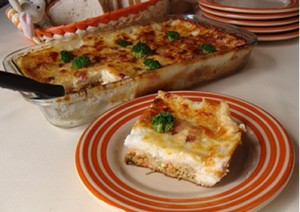 • Em um pirex monte da seguinte maneira: o creme, a lasanha e o frango desfiado e repete.