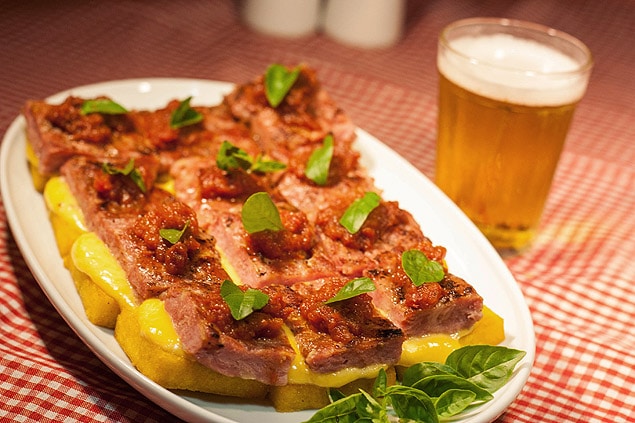 • Ordem da montagem: polenta de aipim, queijo, linguiça, tomate.