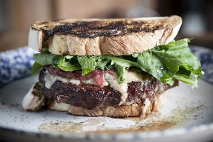 - Depois disso, coloque entre as duas fatias de pão, a carne, a cebola e a rúcula.