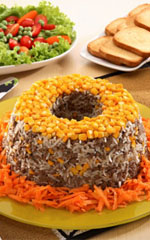 • Numa fôrma (de furo no meio) untada coloque no fundo as 3 colheres de milho verde.