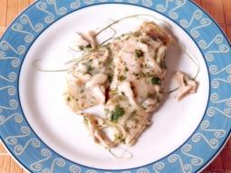 • Em uma panela colocar 1 colher (sopa) de azeite de oliva, 1 dente alho picado e o creme batido, em seguida juntar o caldo que se formou na travessa do peixe assado, até ficar com uma consistência cremosa.