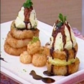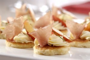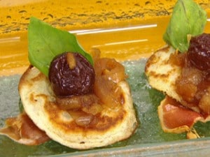 - Coloque os blinis numa fôrma de vidro cobrindo-os com o chutney e decore com ervas frescas.
