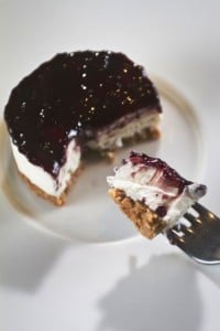 - Decore espalhando a geléia de brilho por cima do cheesecake já montado, coloque as rodelas de abacaxi e as folhinhas de hortelã por cima.