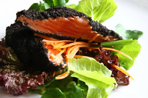 Salmão Empanado na Tinta de Lula com Salada Verde