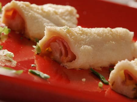 • Coloque os rolinhos num prato, salpique queijo ralado e leve ao forno micro-ondas em potência alta, por 2 minutos.