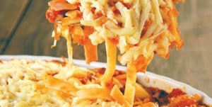 • Em um refratário, alterne camadas de molho, talharim, presunto e queijo coalho.
