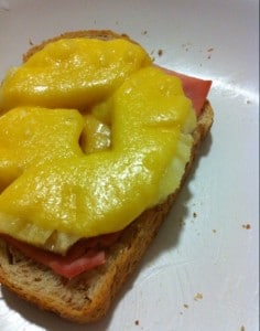 • Cobrir o presunto com o abacaxi e com o queijo.