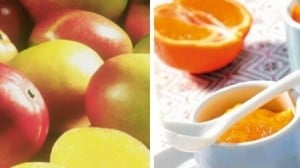 • Descasque as tangerinas, retire-lhes as sementes e coloque-as junto com a manga.