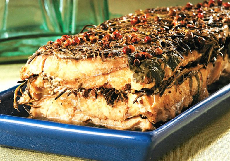 • Faça mais uma camada de pimenta e ervas e novamente cubra com o peixe.