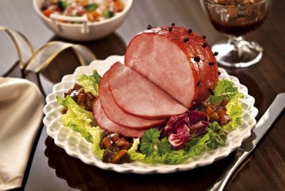 • Em um refratário, coloque o presunto tender, besunte-o com a manteiga e regue com o suco.